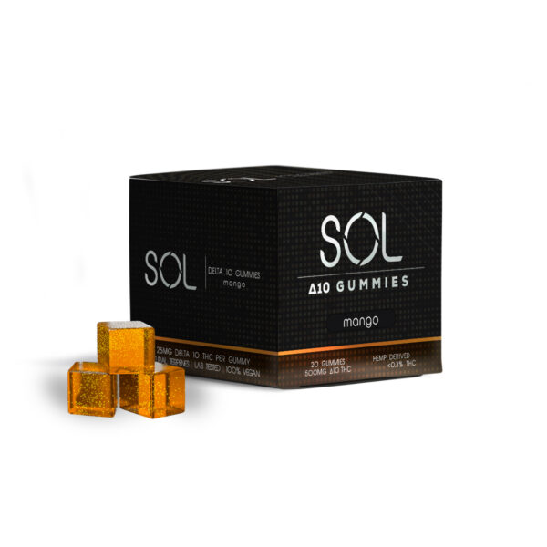 SOL 500mg Delta 10 THC Gummies, Mango flavor, 25mg per gummy.
